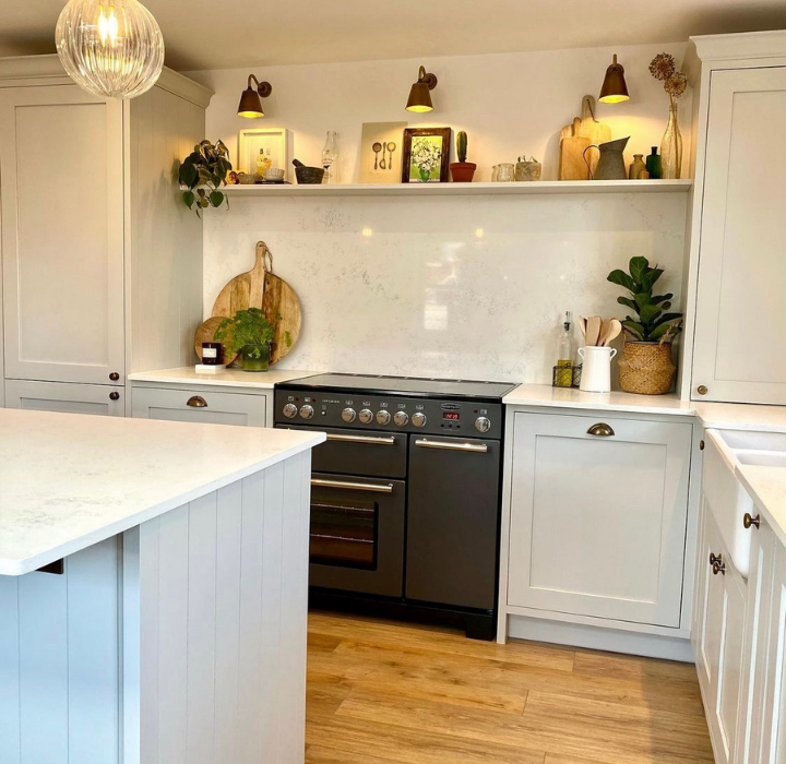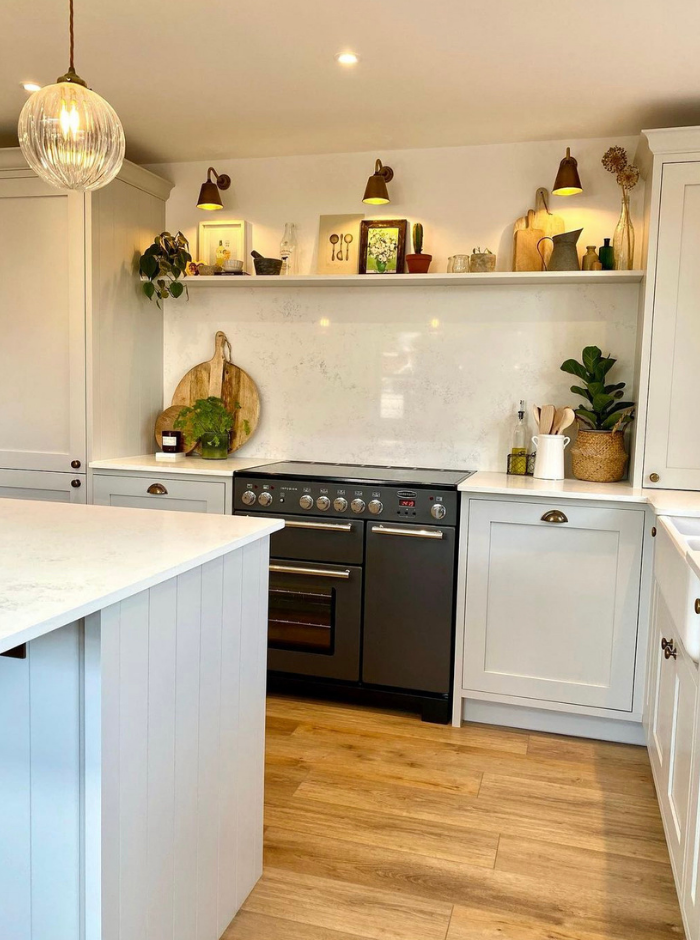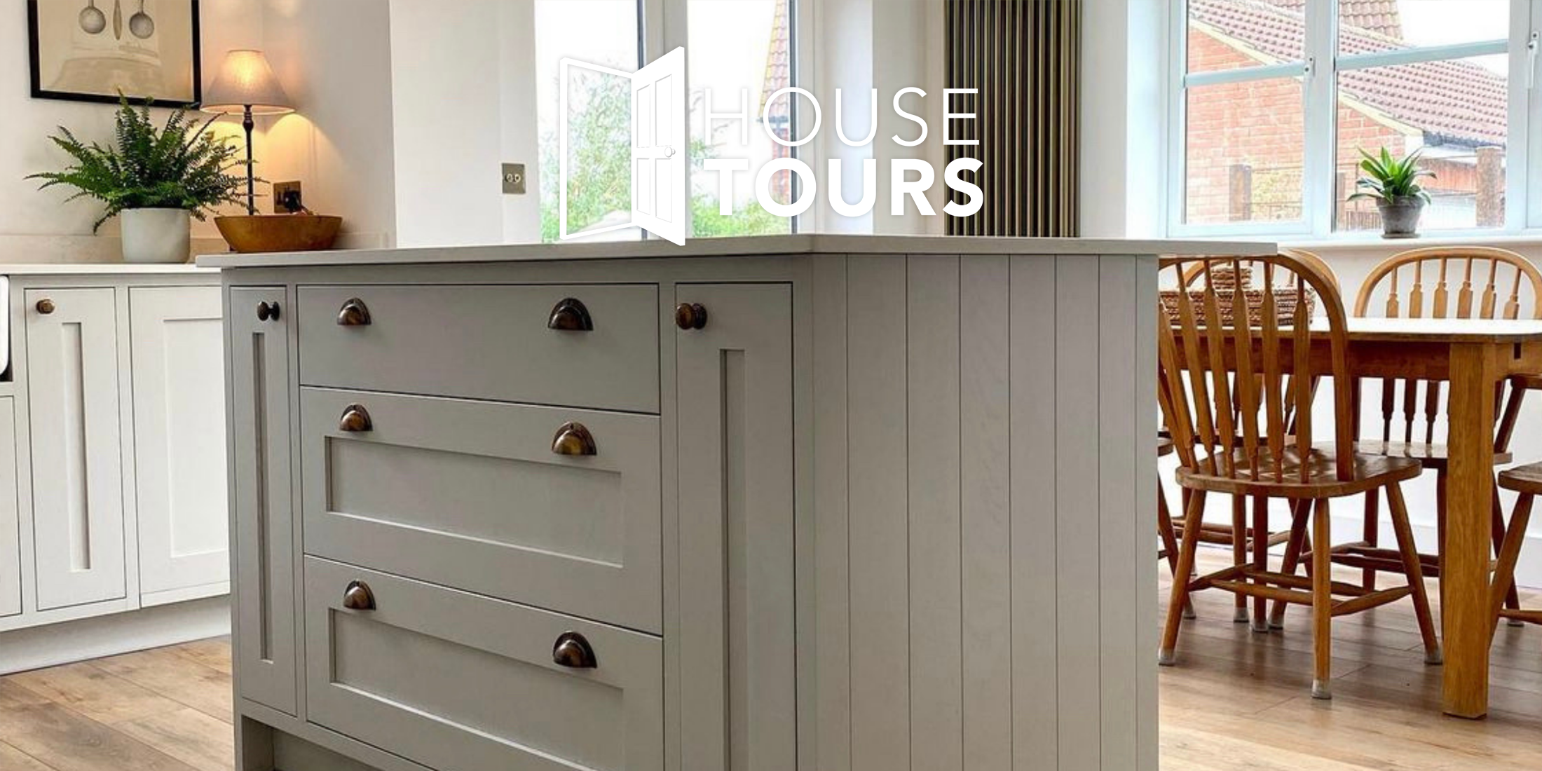 In the kitchen, Sarah has gone for classic Shaker style cabinets with a central island. The Victorian antique brass cupboard knobs and matching kitchen cup pulls are the perfect finishing touch. Traditional style with a timeless contemporary look.
