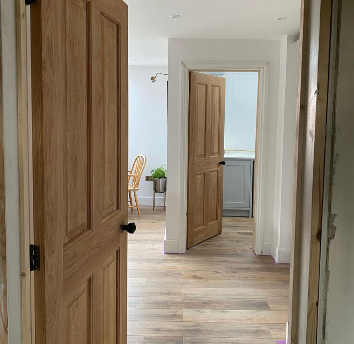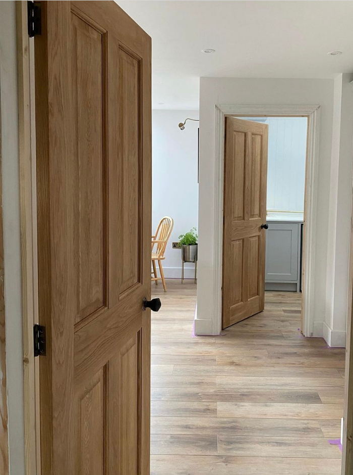 The choice of doors and door hardware compliments the cottage style of the house. These timber panelled doors with wooden ringed door knobs in an ebonised finish co-ordinate with the brass highlights elsewhere in the house. The rim lock on the bathroom door is a lovely detail.