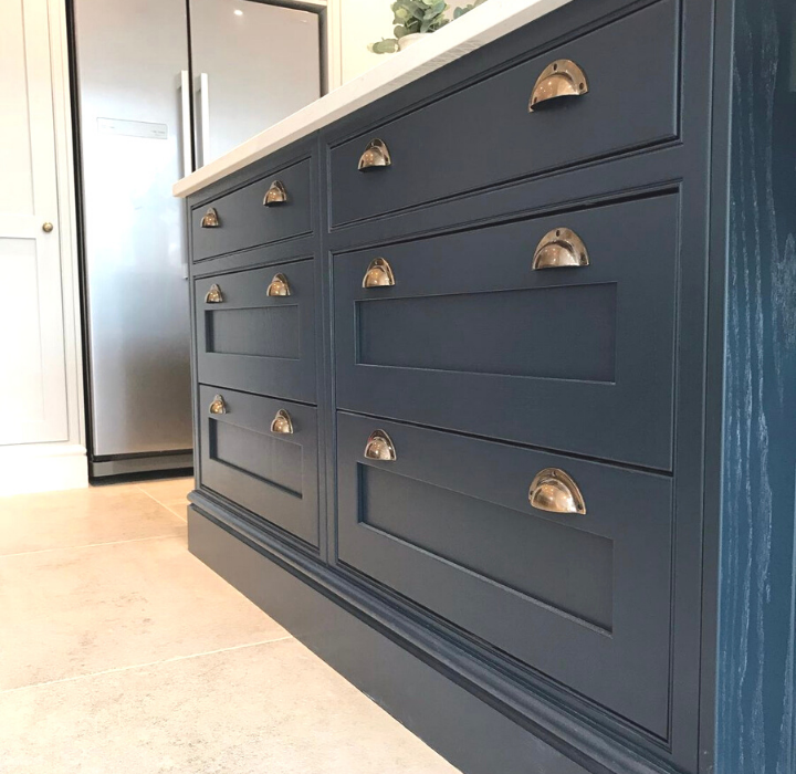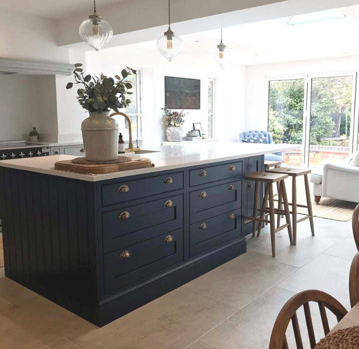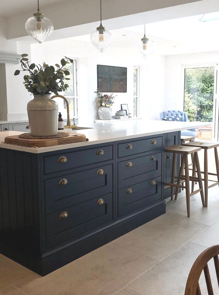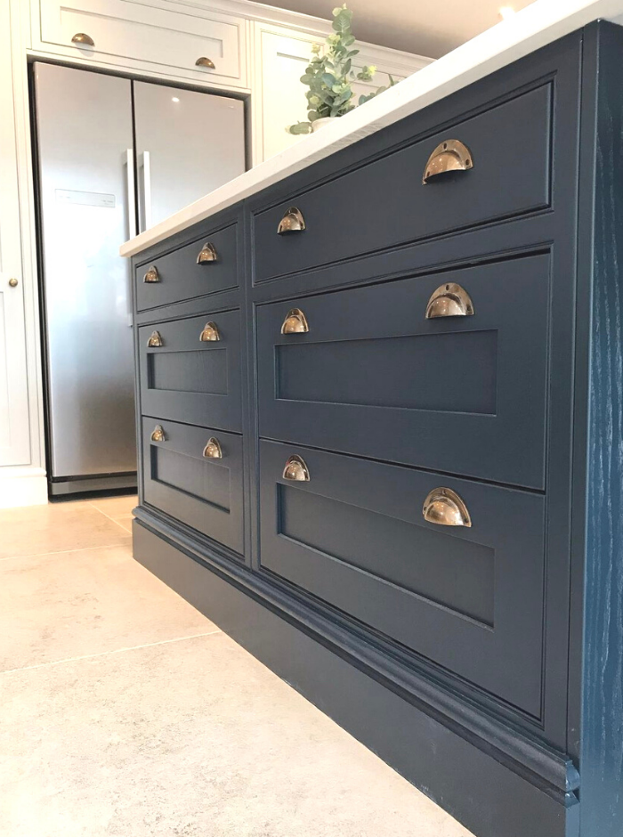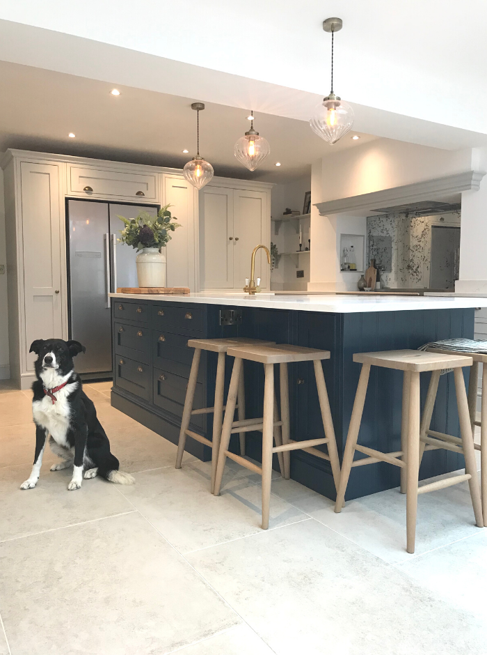 The result is a stunning classic kitchen with tongue and groove detailing and upmarket shaker style cabinets. The central island is painted a darker colour of cobham blue and the rest of the cabinets in dove grey. The choice of antique brass hardware completes the timeless look, with a striking antique mirror splashback behind the hob.