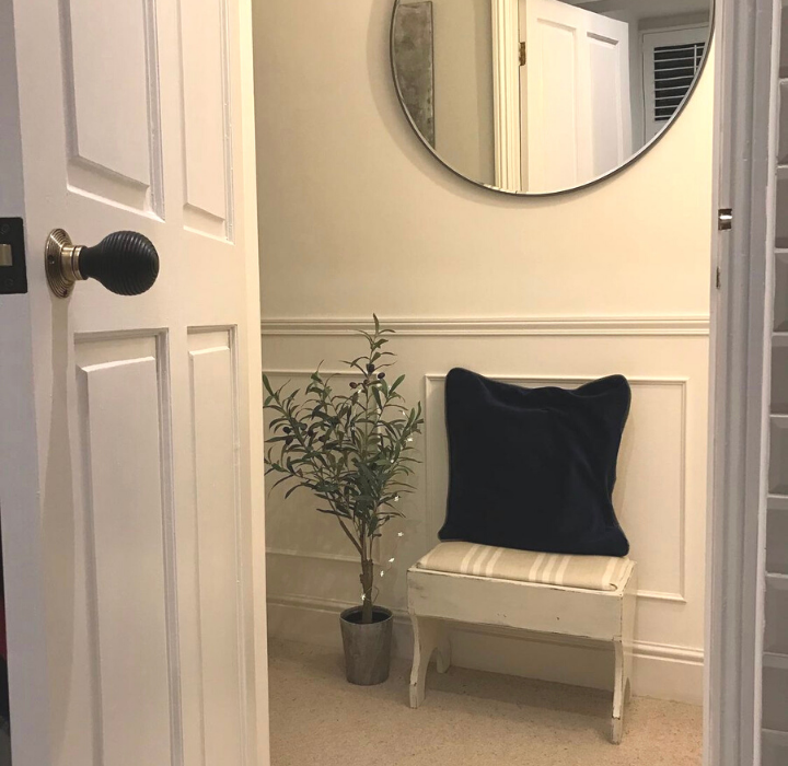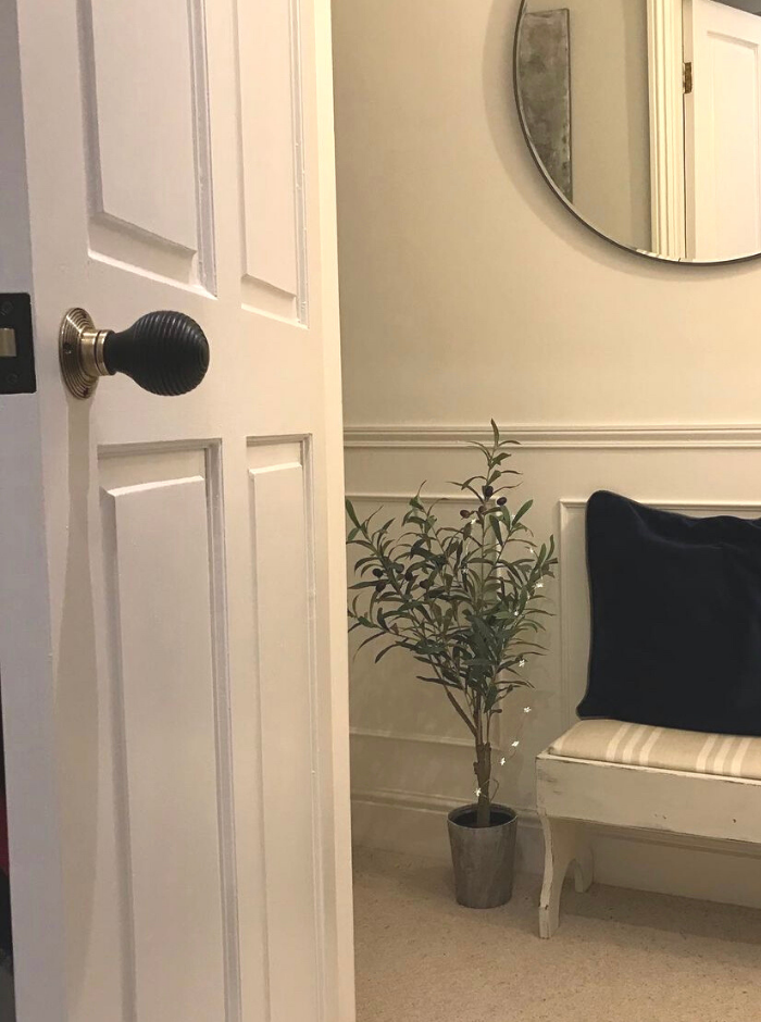 The upstairs panelled doors were a real find and were a rescue project from a skip. Once they were painted white, Kat looked for the right door knobs. She wanted to find a style that would complement the classic look and fit with the rest of the decor. As soon as she found the ebonised and antique brass beehive door knobs she knew they were the ones!