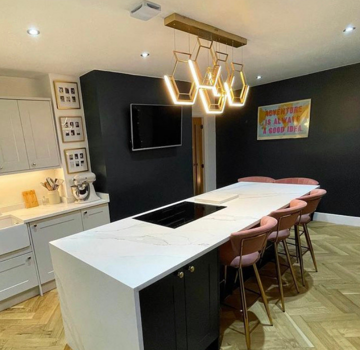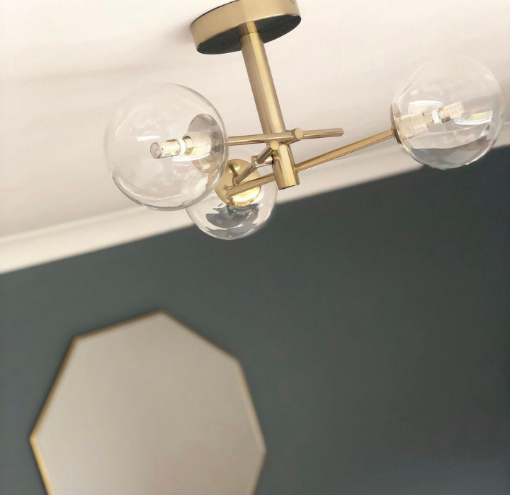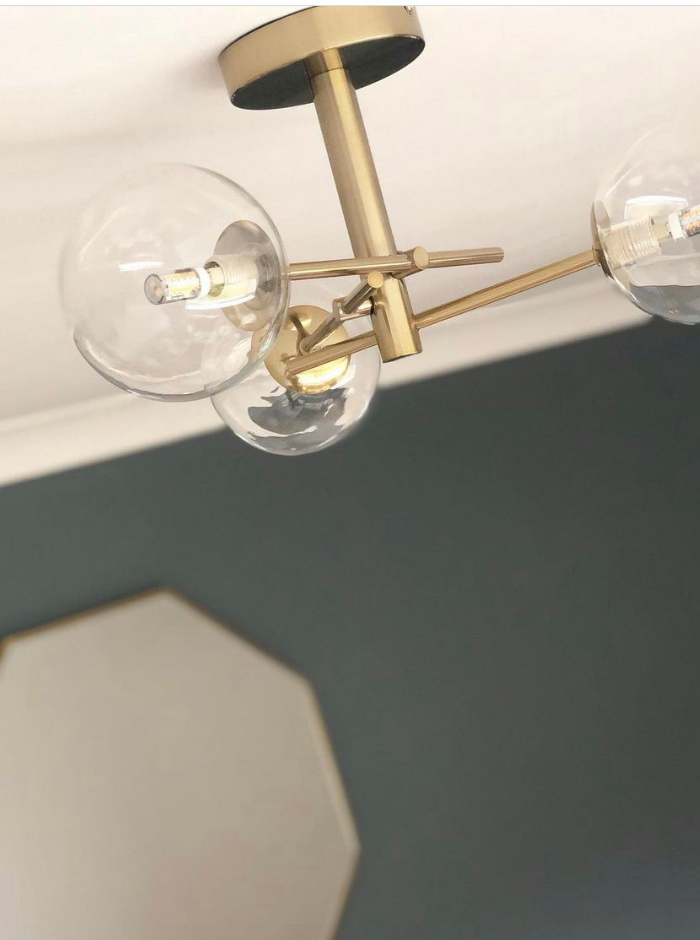 In the living room, there is an unusual art deco style octagonal mirror and a modern light fitting with angular shaped gold fittings and circular glass shades. These work so well together and also pick up on the geometric theme in the kitchen, with the stunning hexagonal feature light and art deco bar stools.