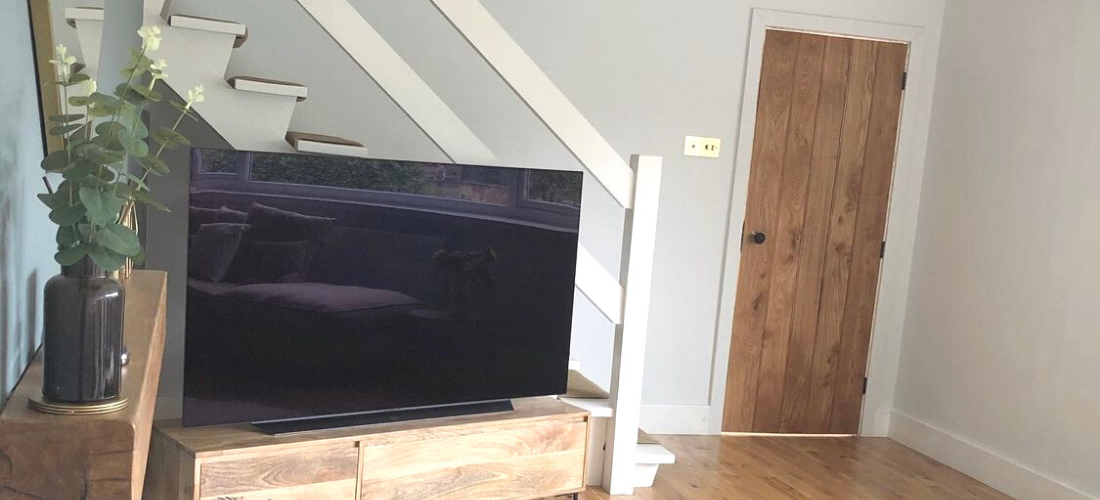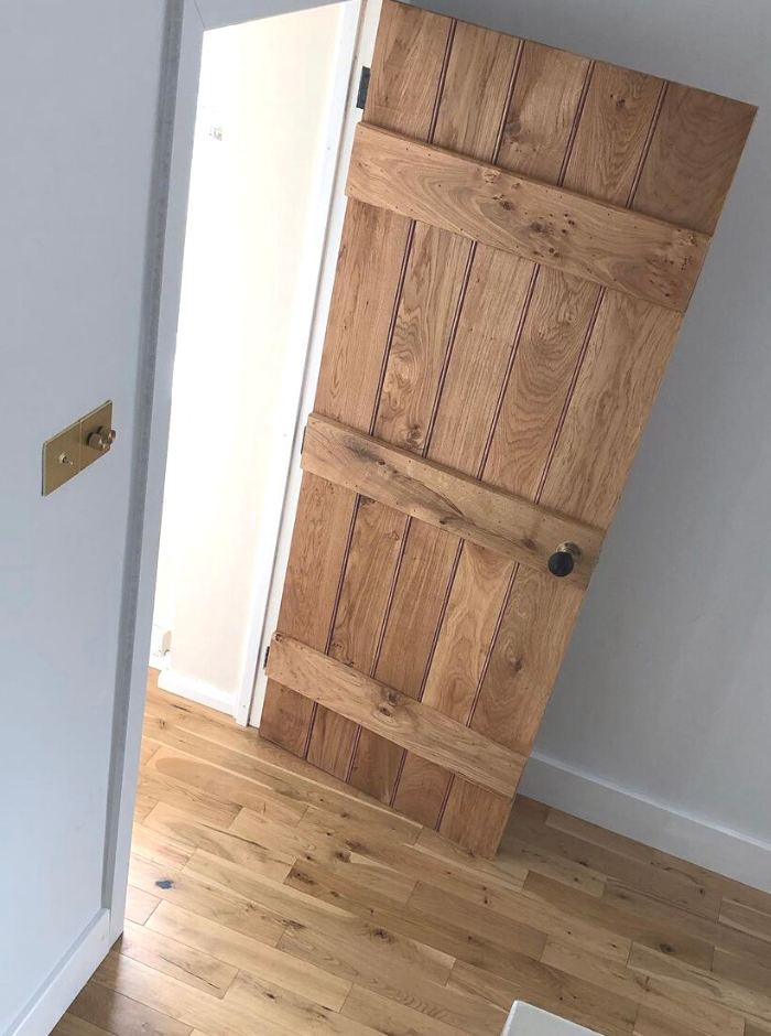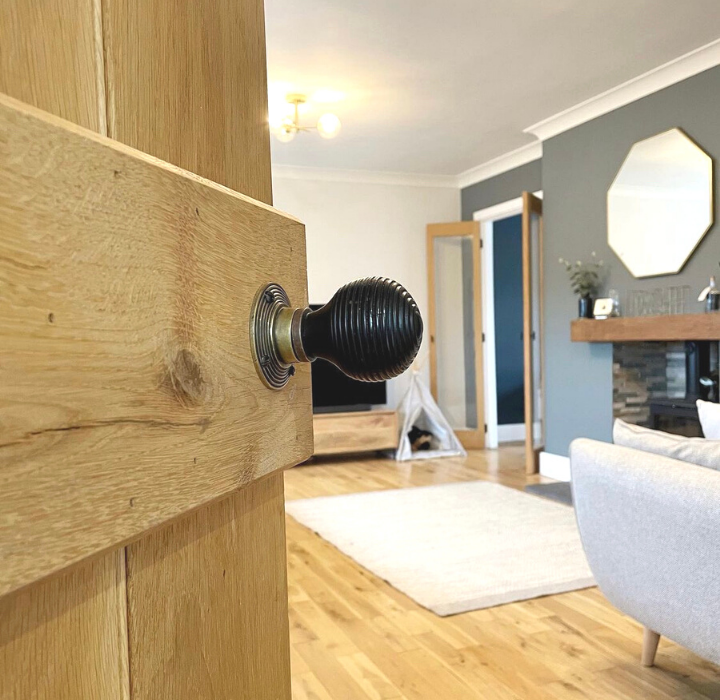The house originally had white painted panelled doors with old brass handles. Hannah & David wanted to find doors with more of a contemporary look while retaining that all important timeless appeal. They decided to go with cottage style ledge and brace doors with beehive door knobs – a really fabulous eclectic look that works surprisingly well with the modern decor and wooden flooring.