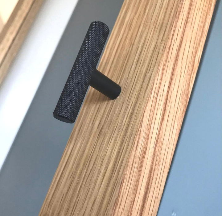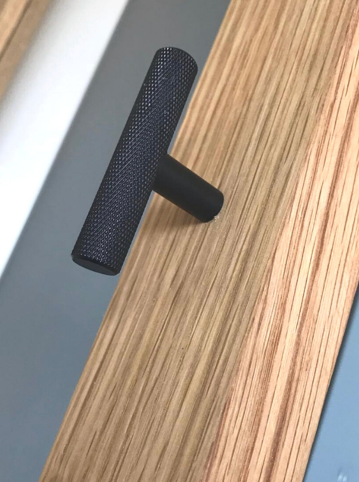 Between the living room and kitchen, the double doors were originally traditional, multi-paned with brass knobs. These have now been replaced with beautiful oak frame glazed doors with a modern t bar black pull handle. Simple and modern. The single panes bring more light into the room, making it feel more spacious and brighter.