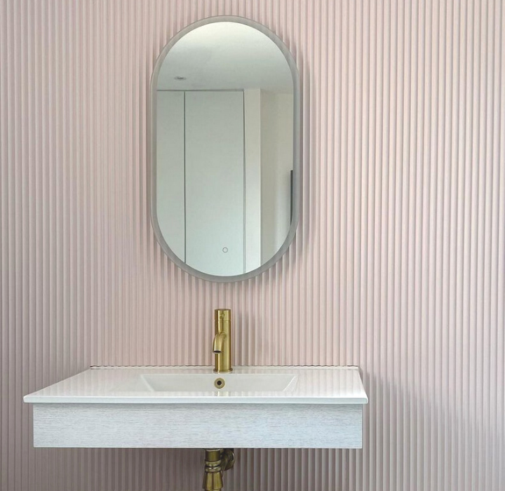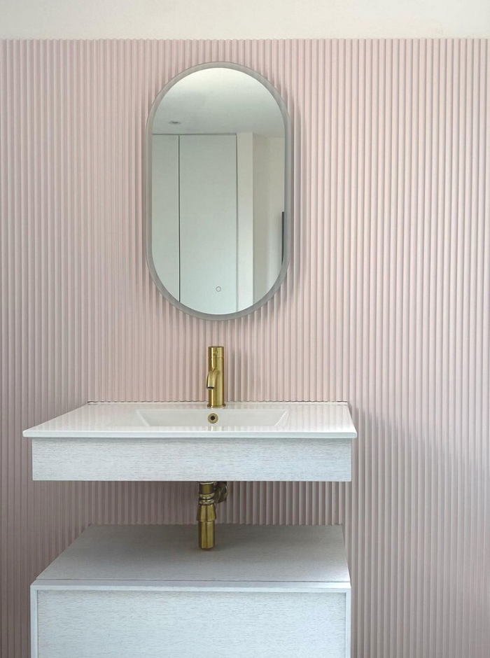 The result is a wonderful comination of modern and vintage, with satin gold coloured hardware and an art deco vibe. This also echoes the bathroom choice, where there are satin brass taps and bathroom hardware.