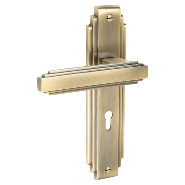 These Art Deco Handles are available in four unique styles: Astoria, Atlantis, Tiffany and Waldorf. If you are looking for a matching Art Deco door knob see also the striking Charlston design - a rectangular shaped door knob on a long back plate with the classic Art Deco stepped pattern.