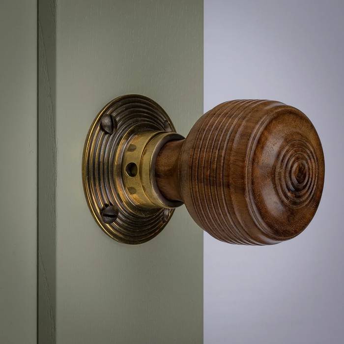Our natural wooden knobs are made from hand turned solid rosewood with a polished or ebonised finish. Choose from Georgian, Bun, Ringed, and the ever popular Beehive designs. The rose plates for these wooden door knobs are crafted from solid brass with a choice of antique brass or chrome options.