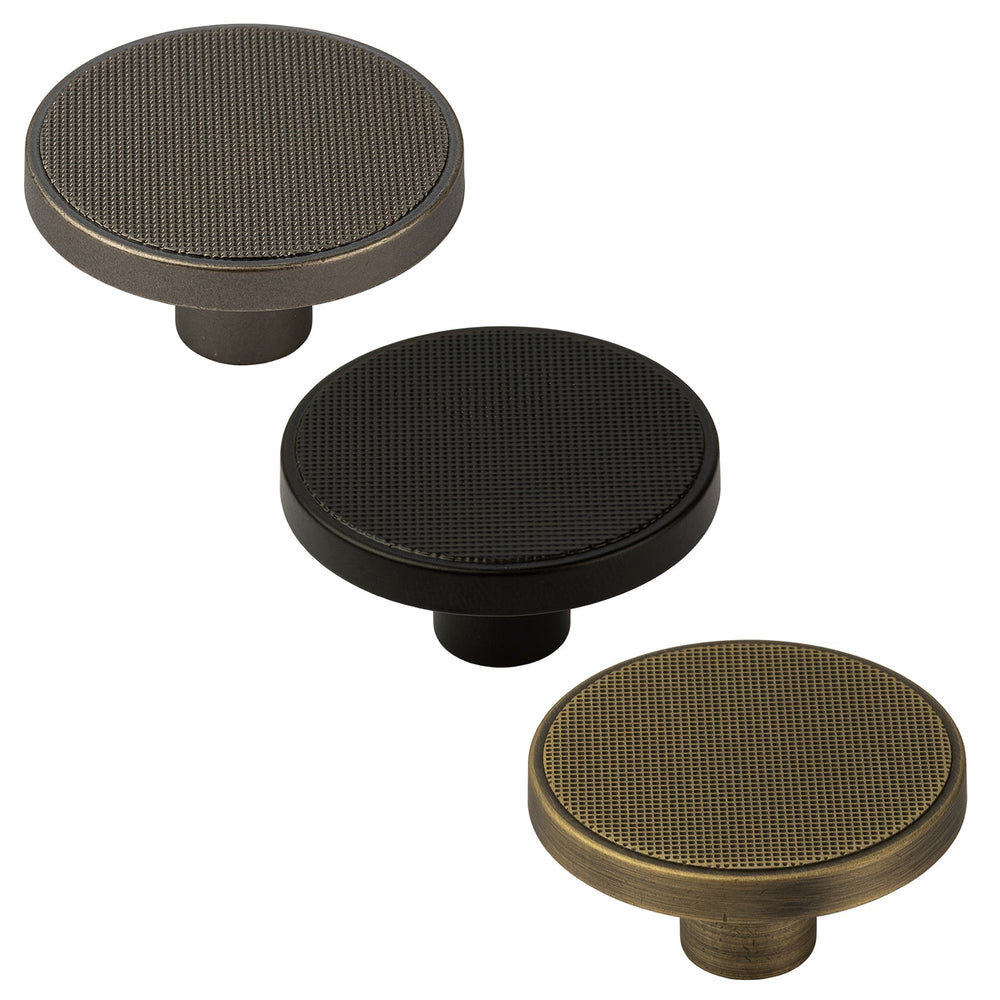 Contemporary cabinet knobs for your drawers and cupboards. These Brooklyn Cupboard Knobs complement the other pulls and knobs in our modern cabinet handle collection. The etched surface design of the Brooklyn Knob co-ordinates especially well with the Canyon Pull and is ideal for utilitarian style kitchens & homes.