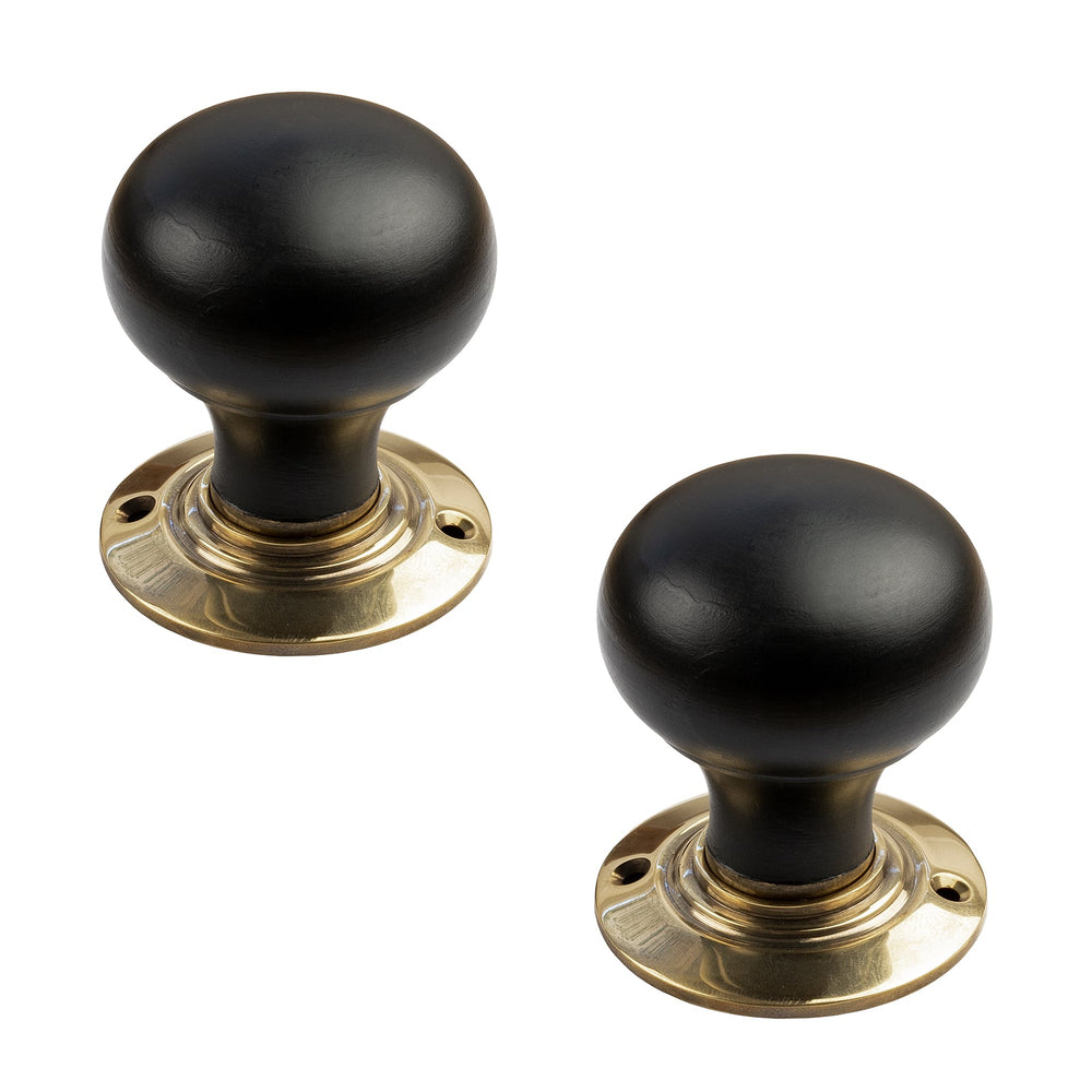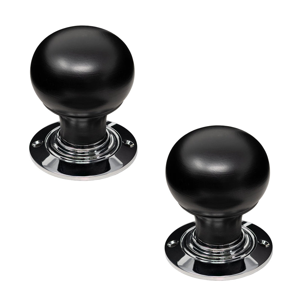 These door knobs are hand turned from high quality solid rosewood and available in a polished or an ebonised lacquer finish. The rose plates are made from solid brass with an antique brass and chrome finish. The antique brass rose plate offers a classic look, whereas the chrome option is ideal for contemporary interiors.