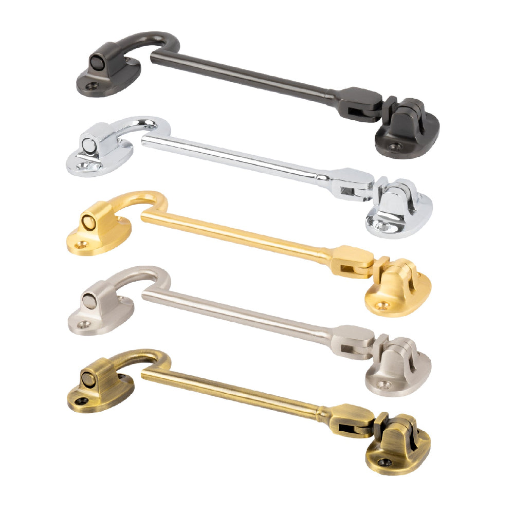 Classic Cabin Hooks are suitable for internal and external doors. These hook and eye latches are made from quality solid brass in 4 inch and 6 inch sizes. Available in five beautiful finishes to match our Brass Front Door Furniture and Rose Door Handles range. Choose from Aged Brass, Matt Bronze, Polished Chrome, Satin Brass & Satin Nickel lacquer finishes.