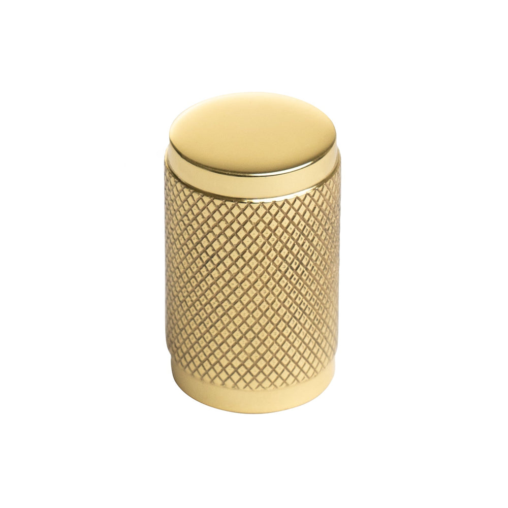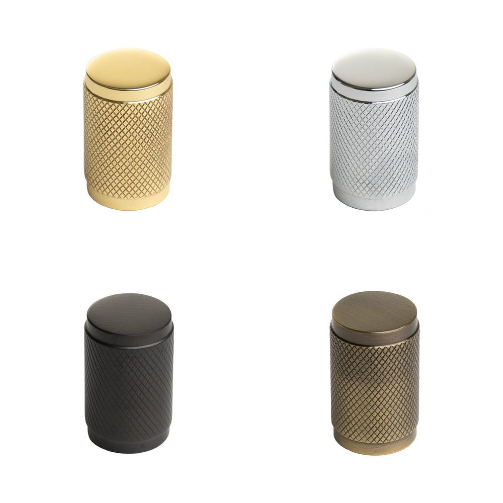 On trend Cylinder Knurled Cabinet Knobs are solid brass kitchen cupboard knobs, available in six distinctive finishes: aged brass, polished brass, polished chrome, satin brass, satin nickel & matt bronze. The knurled effect on these cupboard door knobs is a classic criss-cross pattern and allows for a better grip as well as providing a modern industrial design. Co-ordinate with matching Knurled Pull Handles.