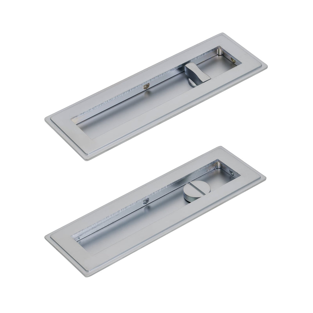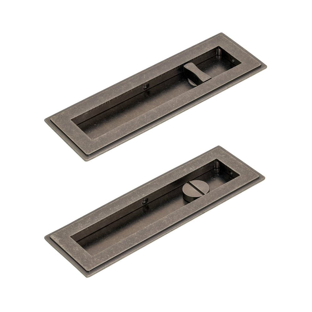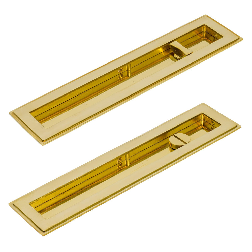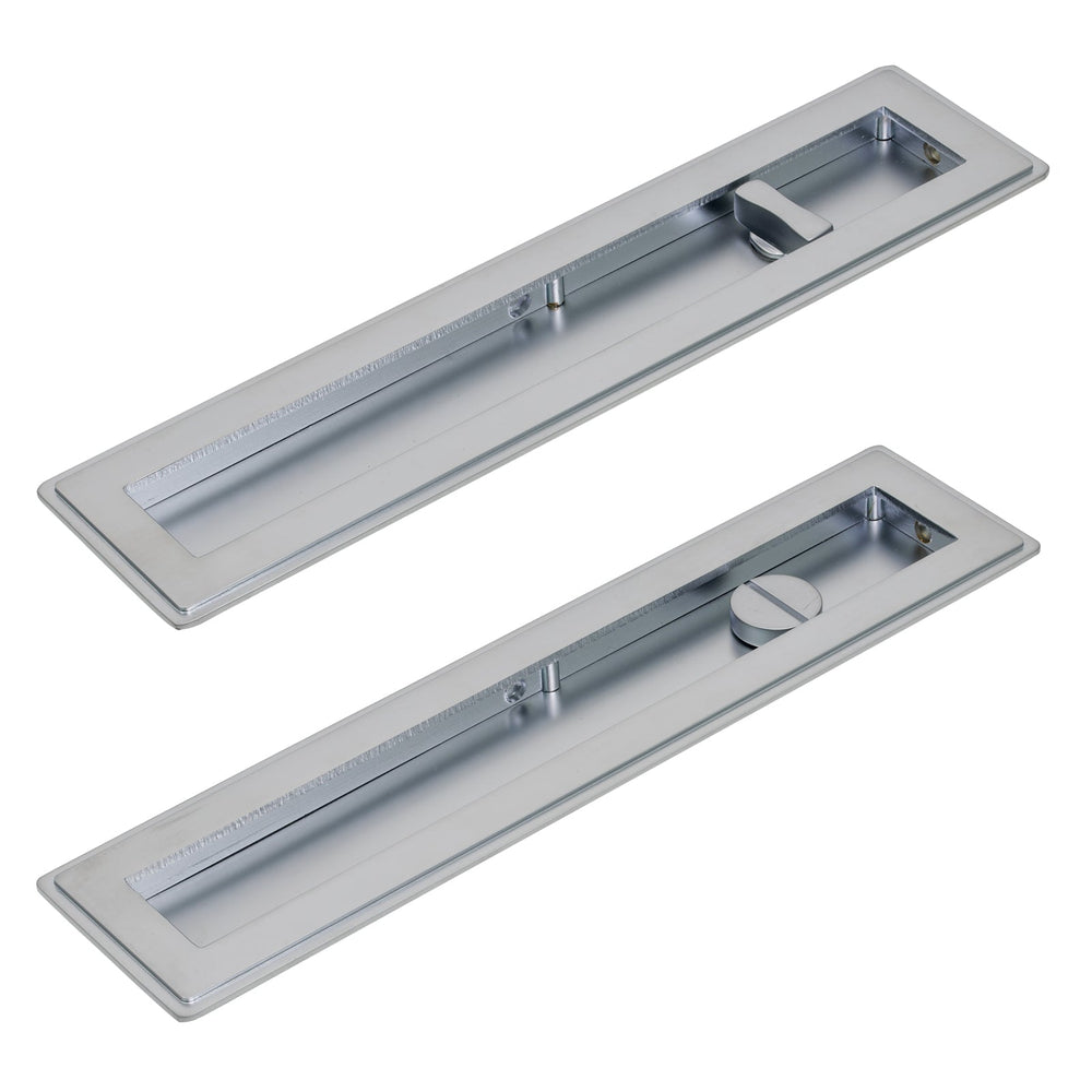 These Art Deco Flush Pull Privacy sets feature a pair of flush pull handles with a built in turn and release mechanism to be paired with a sliding door lock (not included).