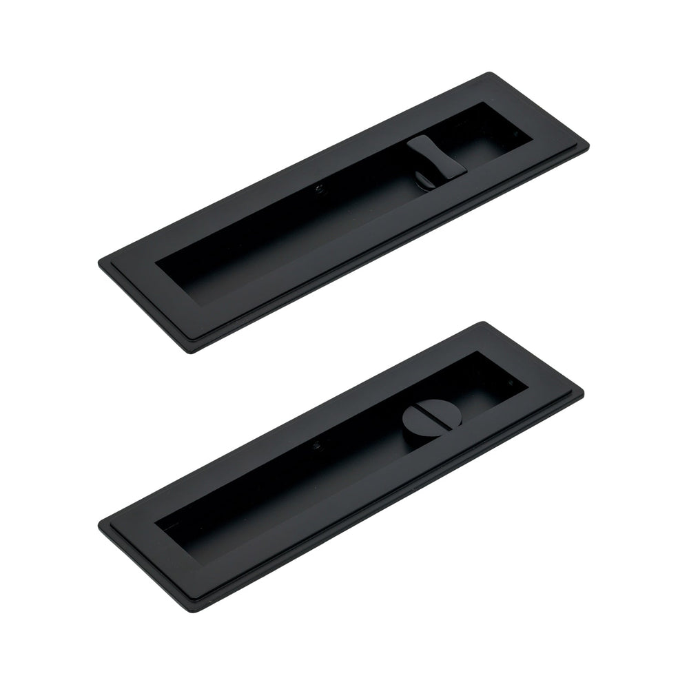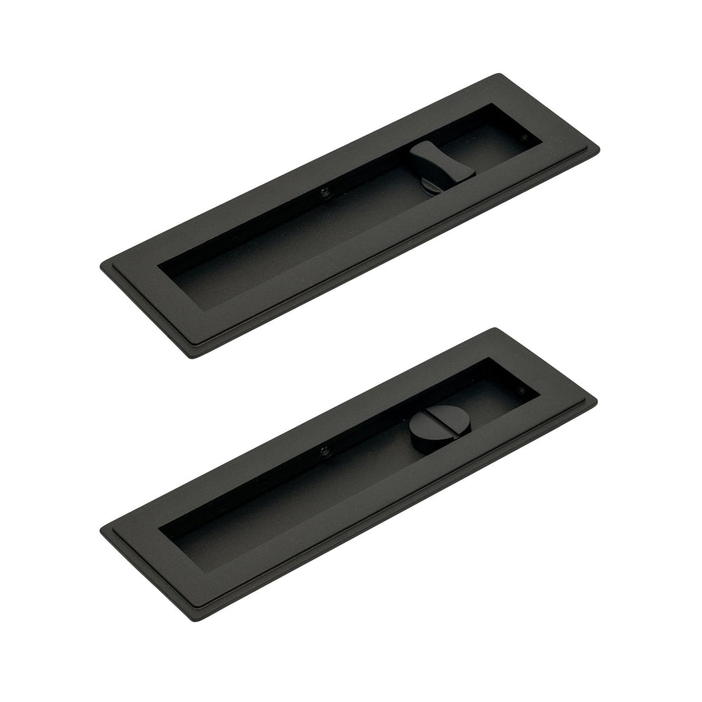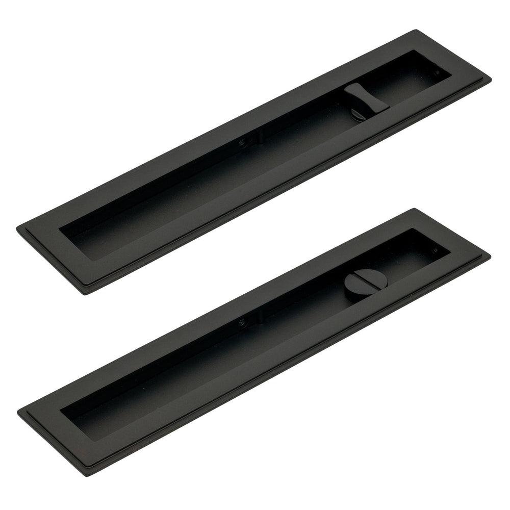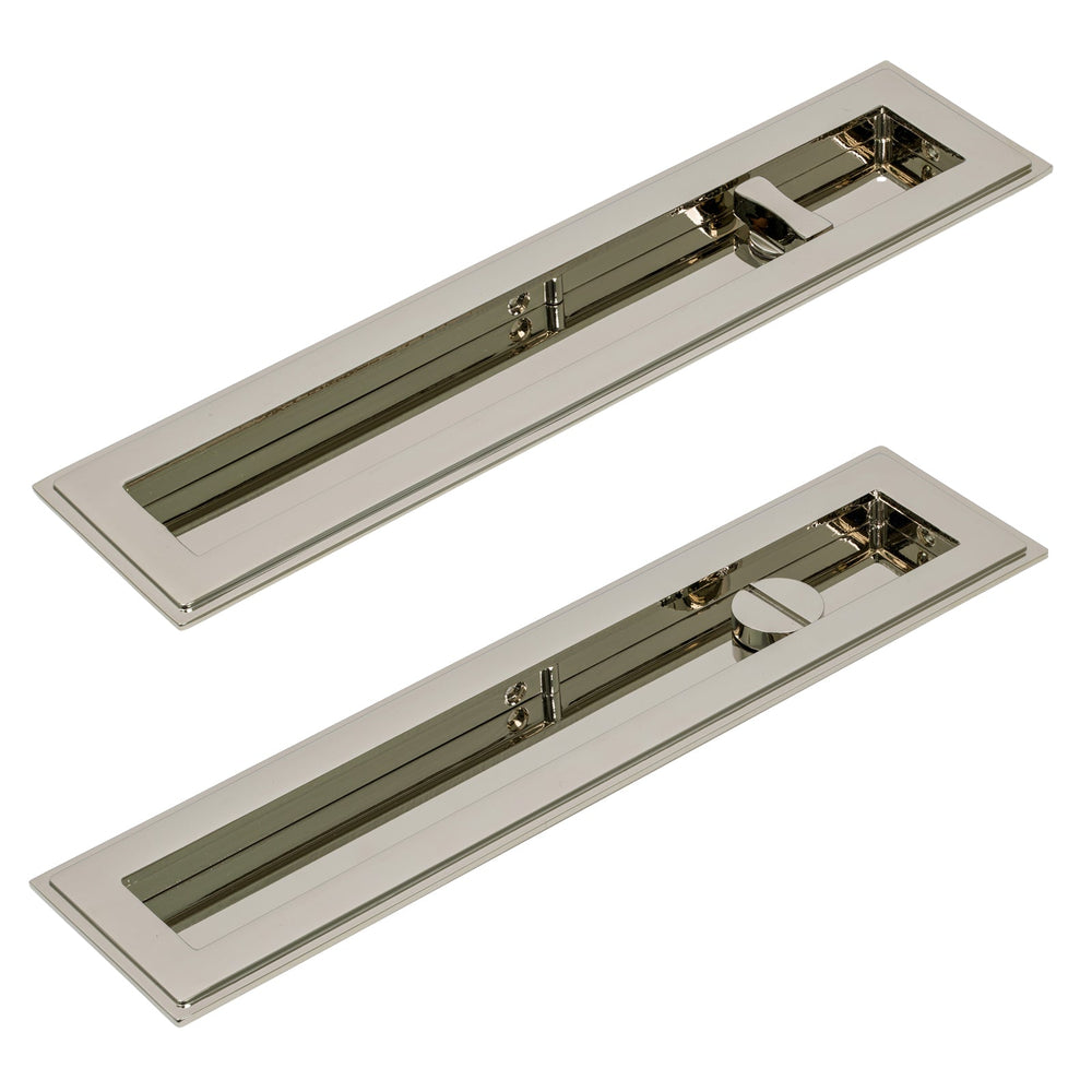 These Art Deco Flush Pull Privacy sets feature a pair of flush pull handles with a built in turn and release mechanism to be paired with a sliding door lock (not included).