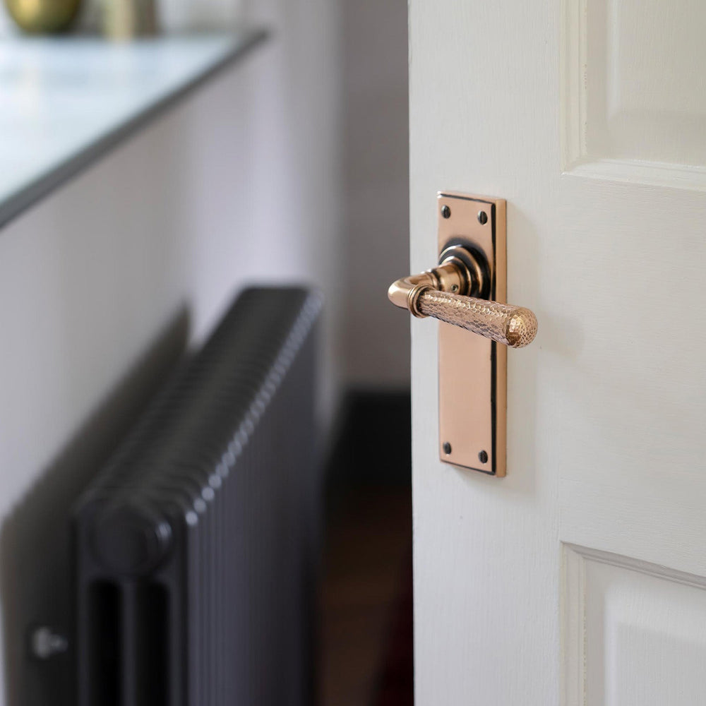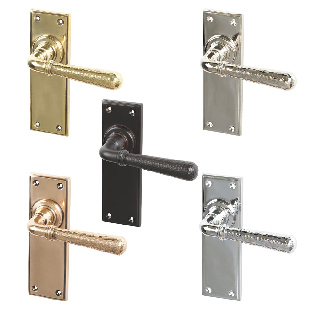 The weighty Hammered Newbury lever handle is forged from solid brass, making it both beautiful and durable. It’s an excellent design choice for your home, with many matching products available. The handle features a strong spring built into the boss design, offering both style and practicality.