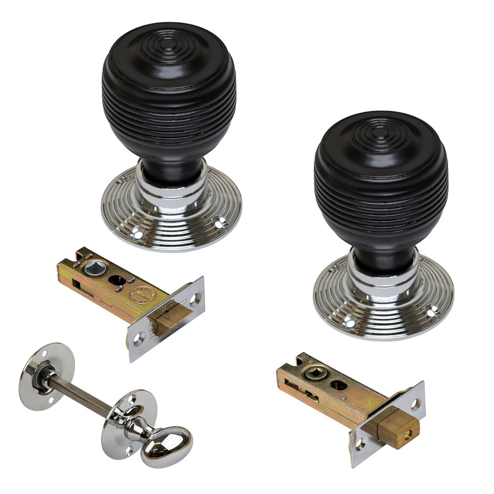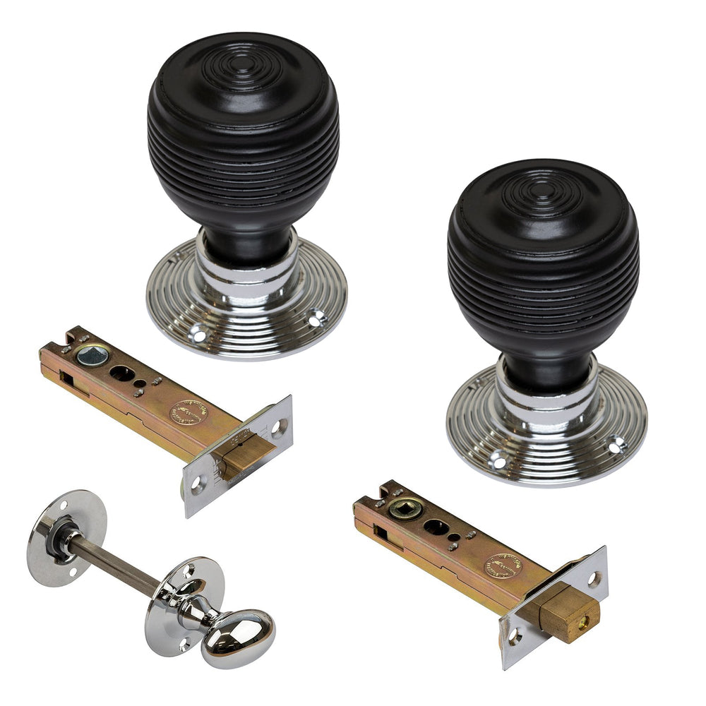 - Bathroom Set: Pair of Georgian knobs, a 3 or 4 inch Fire Rated CE 1121 heavy duty tubular latch & deadbolt, and matching chrome/antique brass oval turn & release.