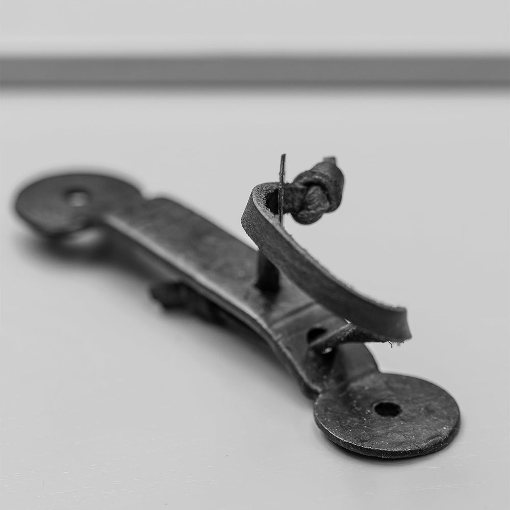 The Penny End Locking Staple Black Beeswax is designed to be fitted to our Suffolk Latch Black. A locking staple is a privacy lock, fitted to the latch bar side of the thumb latch. The pin is secured by a leather lanyard and prevents the latch bar from rising out of the keeper.