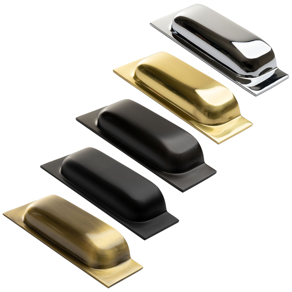 Military Cup Pulls are made from solid brass and make a real statement for your kitchen drawers and cabinets. These large rectangular pull handles have concealed fixings and are available in five distinct finishes: aged brass, polished brass, polished chrome, satin nickel, satin brass, matt bronze & black.