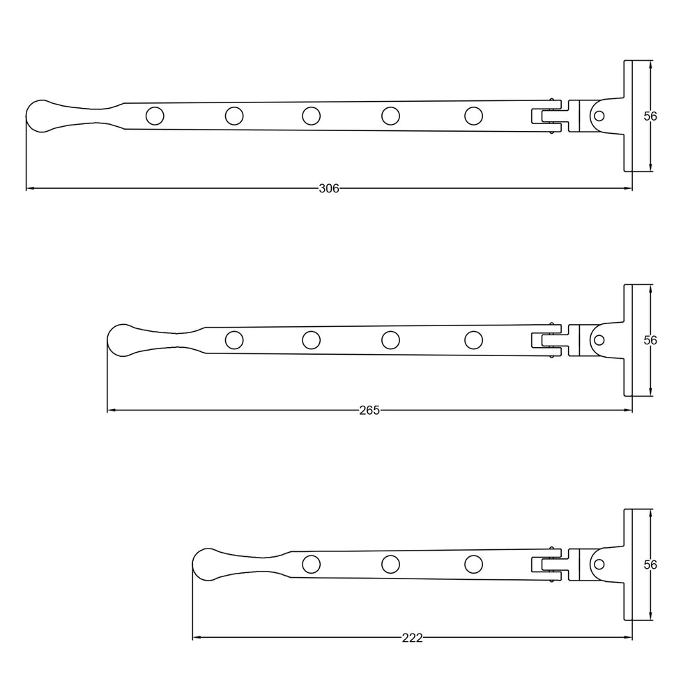 For measurements of the black pear drop window stays, please see the PDF drawing in Dimensions.