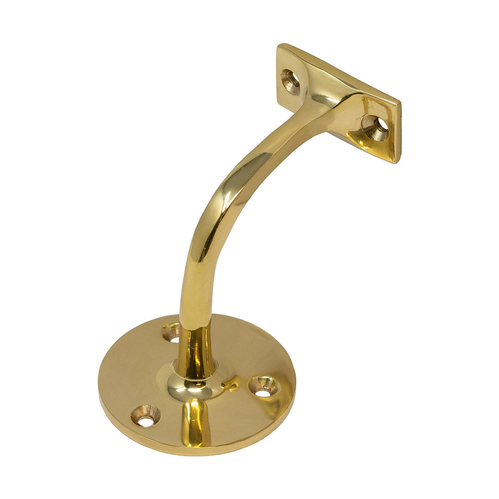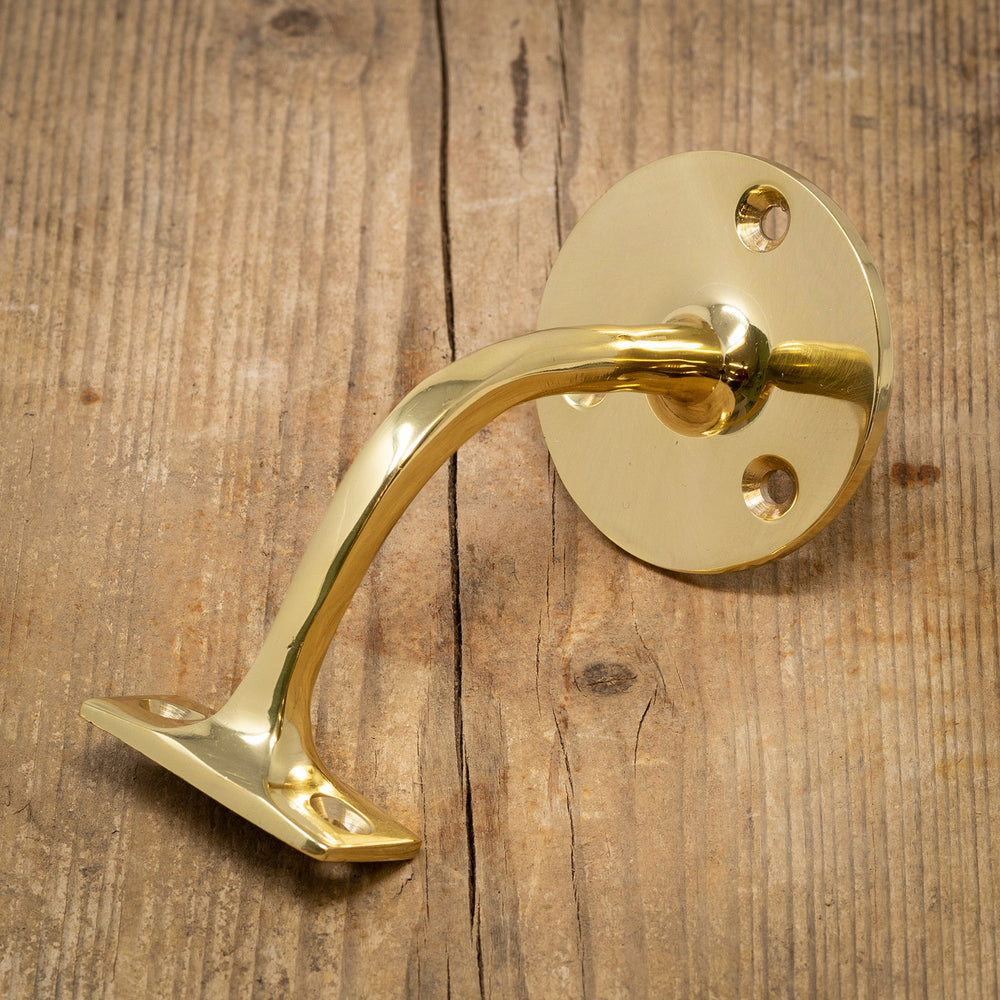 A brass handrail bracket for supporting bannister stair rails. This wall rail bracket works well in contemporary or traditional homes and can also be used as a small grab handle in bathrooms. See also our Antique Brass Handrail Bracket.