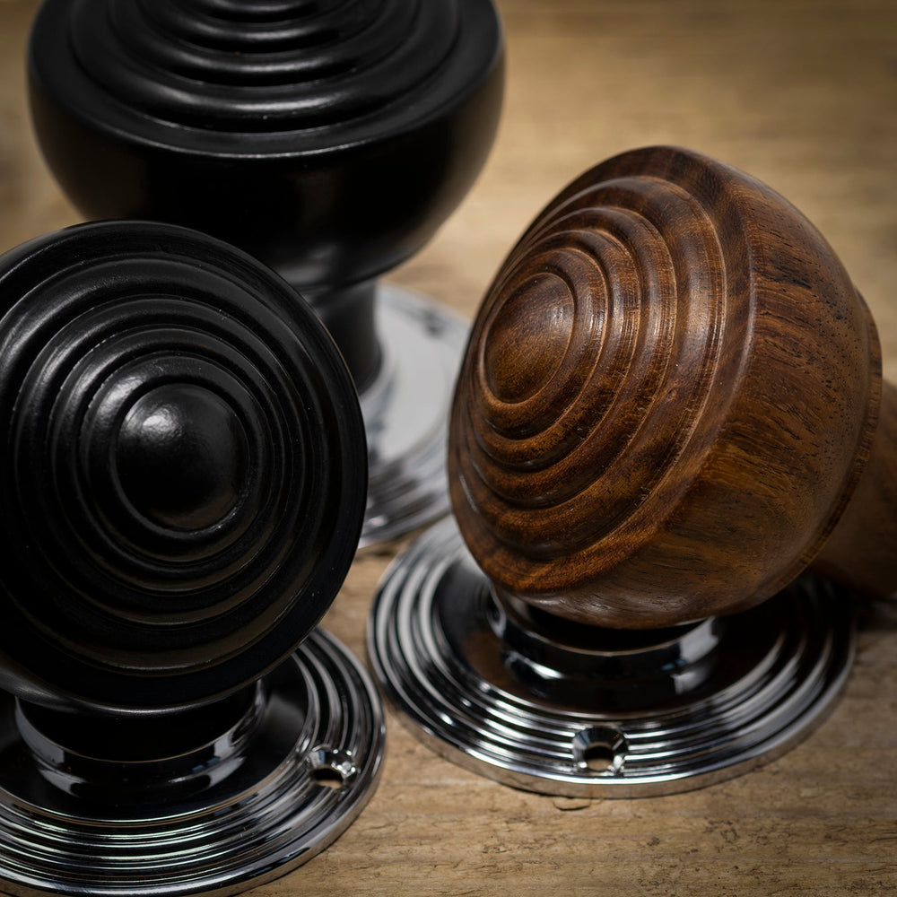 Ringed door knobs are made from solid rosewood and available in polished rosewood or ebonised finishes, with a choice of antique brass or chrome rose plates. These wooden knobs have a reeded design that is inspired by antique Georgian door knobs. Ringed door knobs are the perfect choice for period properties. Complete the look with matching Wooden Finger Plates.