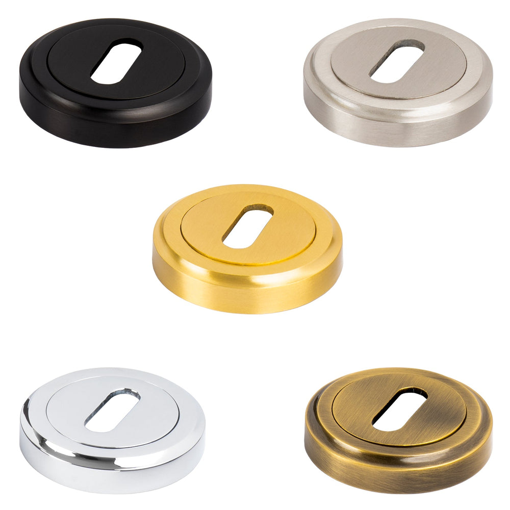 This door escutcheon is made from quality solid brass and available in a range of finishes to match our Brass Front Door Furniture and Door Handles On Rose. Choose from aged brass, chrome, bronze, satin brass and satin nickel finishes - something for every home.