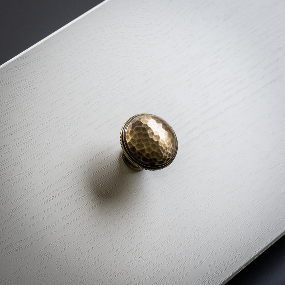 Hand Beaten Cabinet Knobs have a decorative hammered design inspired by traditional hand beaten methods. These drawer and cupboard knobs are made from solid brass.
